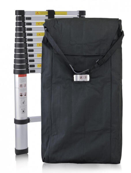 A táska szilárd anyagból készült, teleszkópos létrák tárolására és szállítására alkalmas. A vállpántnak köszönhetően a létra súlya nagyobb felületen osztódik el. A táska közepén elhelyezett nyíláson keresztül pedig nagyon könnyen megfogható. Méret: 35x15x90 cm A vállpánt hosszúsága: 100 cm