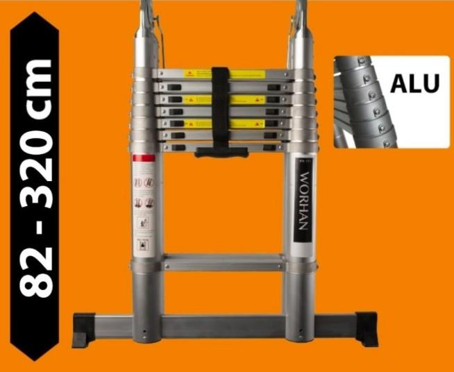 Teleszkópos, kétágú létra Magasság egyágú létraként: 320 cm Magasság kétágú létraként: 156 cm Magassága összecsukva: 82 cm Létrafokok száma: 2x5 Szélesség felül: 46,5 cm Szélesség alul: 46 cm Stabilizáló talp szélessége: 68 cm Belső szélesség: 33,1 cm Maximális teherbírás: 150 kg Mindig győződjön meg a létra megfelelő dőlésszögről, és a biztonságos elh