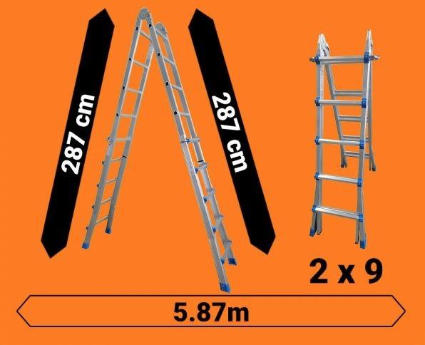 Kétágú létra Adatok: 2x9 létrafok Teljesen kinyitva: 587 cm Kétágú létraként: 287 cm Összetolva: 163 cm Teherbírás: 150 kg Szélessége: 48 cm Talpak anyaga: csúszásmentes gumi Súly: 13,3 kg Mérete összecsukva: 163X48x20 cm További információk:Többfunkciós kétágú létra Elősegíti a munkát a magas vagy nehezen hozzáférhető helyeken is. Tökéletes beltéri és kült