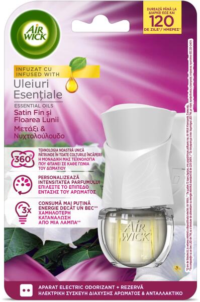 Air Wick Electrical készülék bársonyos szatén és éji liliom, 19ml Termék információkAkár 100 napig tartó illat*A szükséges hozzávalókNagyszerű illatanyag: természetes illóolajjal. Aceton nélkül. *Alacsony illatintenzitási szint mellett, napi 12 óra használat esetén. Használati útmutatóHasználat előtt olvassa el figyelmesen a biztonsági információt. 1. Vegye le a pa