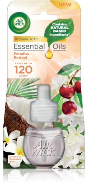 Air Wick Paradise Retreat, 19 ml, Légpárásítók Illatok lakásba, A helyiséget illatosító és kellemes atmoszférát teremtő Air Wick Paradise Retreat légfrissítő semlegesíti a szagokat és azonnali segítséget nyújt a kellemetlen szagok ellen folytatott otthoni küzdelemben. Tulajdonságok: virágos illat édes aroma nyári illat Összetétel: esszenciális olajokkal Használata: Ta