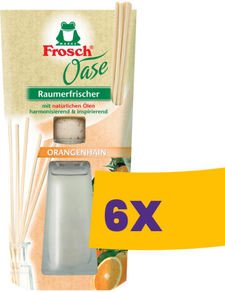 A környezetbarát Frosch Oase pálcás légfrissítő természetes narancs illóolaj tartalmának köszönhetően kellemes illatot biztosít otthon vagy a munkahelyen. A csomagolás tartalmaz egy dekoratív 90 ml-es üveg vázát, valamint egy csomag rattan pálcikát. Attól függően, hogy mennyi pálcikát helyezünk az üvegbe, szabályozhatjuk az illat intenzitását: minél több pálcikát