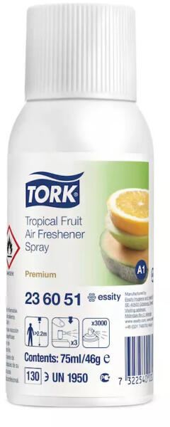 A Tork trópusi gyümölcsös illatosító spray-vel eredményesen és hatékonyan kezelhetők a kellemetlen szagok a mosdóban. A spray koncentrált illóolajat és saját fejlesztésű szagsemlegesítő anyagokat tartalmaz, így megszünteti a kellemetlen szagokat, és tartós, friss illatot biztosít. A spray a Tork illatosító spray adagolóval együtt használható. A Tork trópusi gyümölc