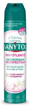 A Sanytol fertőtlenítő légfrissítő aerosol egyedülálló összetételének köszönhetően semlegesíti a kellemetlen szagokat és elpusztítja a felületeken és textíliákon megtelepedett kórokozók 99,9%-át. - 4 az 1-ben formula, fertőtlenít és tisztít, semlegesíti és eltünteti a szagokat (beszívja és semlegesíti a szagokat és megszünteti azok okát, a mikróbákat) - nem