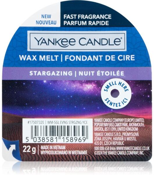Yankee Candle Stargazing, 22 g, Viasz aromalámpába Illatok lakásba, A lehető legjobb illathatás Yankee Candle Stargazing aromalámpa viasszal érhető el a helyiségben. Mivel a viasz gyorsan és egyszerűen más illatú viaszra cserélhető, bármikor pontosan a hangulatához illő illatot varázsolhat maga köré. Használata: Az aromalámpában olvadó viaszt soha ne hagyja felügyelet né
