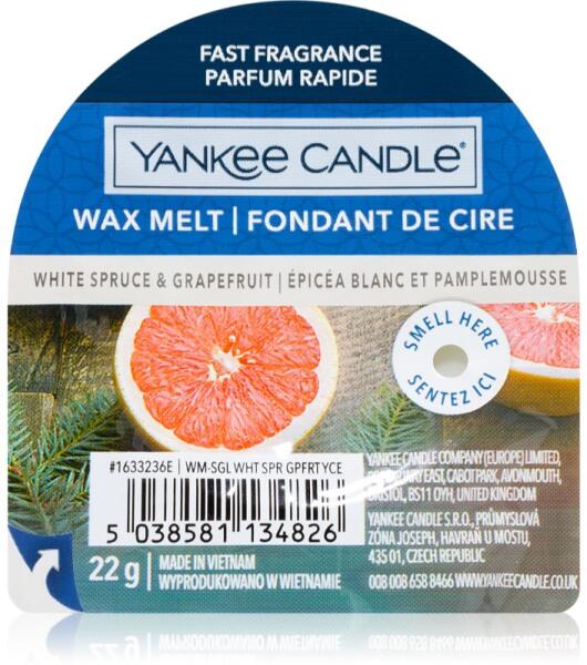 Yankee Candle White Spruce & Grapefruit, 22 g, Viasz aromalámpába Illatok lakásba, A lehető legjobb illathatás Yankee Candle White Spruce & Grapefruit aromalámpa viasszal érhető el a helyiségben. Mivel a viasz gyorsan és egyszerűen más illatú viaszra cserélhető, bármikor pontosan a hangulatához illő illatot varázsolhat maga köré. Tulajdonságok: gyümölcsös illat fen