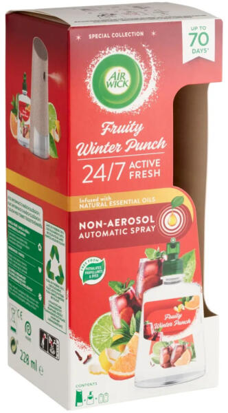 Air Wick Active Fresh készülék és utántöltő Gyümölcsos Puncs illattal! Megérkezett a világ első vízbázisú automata légfrissítője. Élvezze a természetes illóolajokkal átitatott csodálatos illatainkat. A szagsemlegesítő molekulák leküzdik a kellemetlen szagokat. Vízbázisú formulája mentes a ftalátoktól, hajtóanyagoktól és színezékektől. Otthonának elképesztő