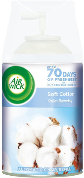 Az Air Wick Freshmatic Soft Cotton légfrissítő spray utántöltő egy illatosító termék, amely kompatibilis az Air Wick Freshmatic automata légfrissítő készülékekkel. Az alábbi termékinformációk relevánsak: Illat: Soft Cotton (lágy, friss, tiszta illat, amely a frissen mosott puha pamut illatát idézi). Kiszerelés: 250 ml spray utántöltő. Használat: Az utántöltő az Air W