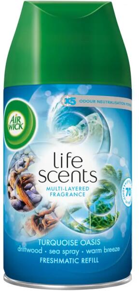 Fokozza otthona frissességét az Air Wick Freshmatic® automatikus spray-kkel. Vegye körül magát a türkizkék öblök érintetlen szépségével, amelyet a napon szárított fa, a sós tenger és a meleg szellő illata áraszt. Az Air Wick Freshmatic folyamatosan friss illatokat bocsát ki, így otthona mindig hívogató illatú marad. Egyszerűen állítsa be a légfrissítőt a kívánt ill