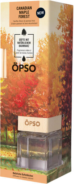 Öpso öko illatosító szett canadian maple forest illat 50 ml Az Öpso Canadian Maple Forest az egyik első természetes fagyantából készült szobaillatosító. Ezt a különleges illatkompozíciót az élénk vörös színű őszi kanadai juharerdők ihlették, a jellegzetes édes és fás aroma különleges hangulatot varázsol otthonába. Engedje, hogy magával ragadja az érzés, mely a k