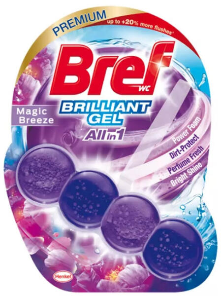 WC ILLATOSÍTÓ GÉL 42 G BREF BRILLIANT MAGIC BREEZE A Bref Brilliant WC illatosító gél egy prémium minőségű WC tisztítószer és illatosító, amely a WC frissítésére és tisztán tartására szolgál. Ez a termék különleges formulával rendelkezik, amely nemcsak tisztítja a WC-csészét, hanem hosszan tartó frissességet és ragyogást is biztosít. Jellemzők: Kiváló minősé