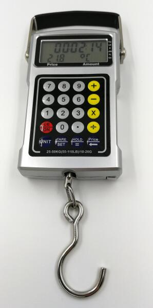 Digitális többfunkciós függő mérleg 7 az 1-ben Funkciók: 1. Digitális akasztós mérleg 50kg-ig 10g pontossággal, 3cm széles acélhoroggal 2. Mérlegelés a mellékelt hevederrel (alkalmas poggyászok mérésére) 3. Árszámítás a megadott egységár alapján 4. Környezeti hőmérséklet kijelzése 5. Időkijelzés - óra 6. Számológép 7. Mérőóra (1m/3ft hosszúságú tekercsm