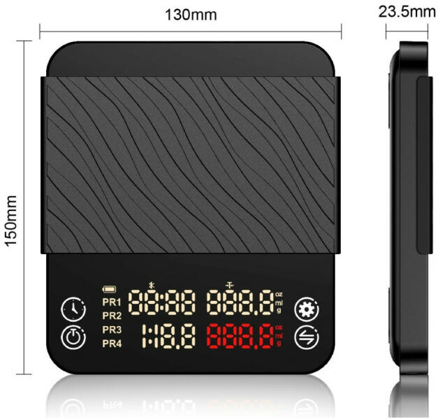 Termék mérete: 130 x 150 x 23,5mm Max kapacitás :2000g Mértékegység: g / oz / ml Pontosság:0,1g Időzítő tartomány: 9' 59’ Súly limit: 2020g Kijelző: digitális 2 soros 2 színű LED-73*15mm Anyag: ABS/Szilikon Elem: beépített újratölthető 1000mAh Líthium akkumulátor Töltési mód: C típusú USB kábellel és 5V DC/1A adapterrel (az adapter nem tartozék)