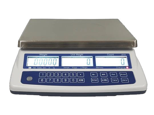 Darabszámláló mérleg, gyártói hitelesítéssel, beépített akumlátorral, rozsdamentes mérőlappal, 3 db LCD kijelzővel(tömeg/egységtömeg/darabszám), háttérvilágítással. Funkciók: Darabszámláló mérleg, három kijelző(,tömeg/egységtömeg/darabszám), Összeadás funkcióval, Tárázás Műszaki paraméterek: Váltóértékes kivitel, numerikus billentyűzet, Alsó- és fel