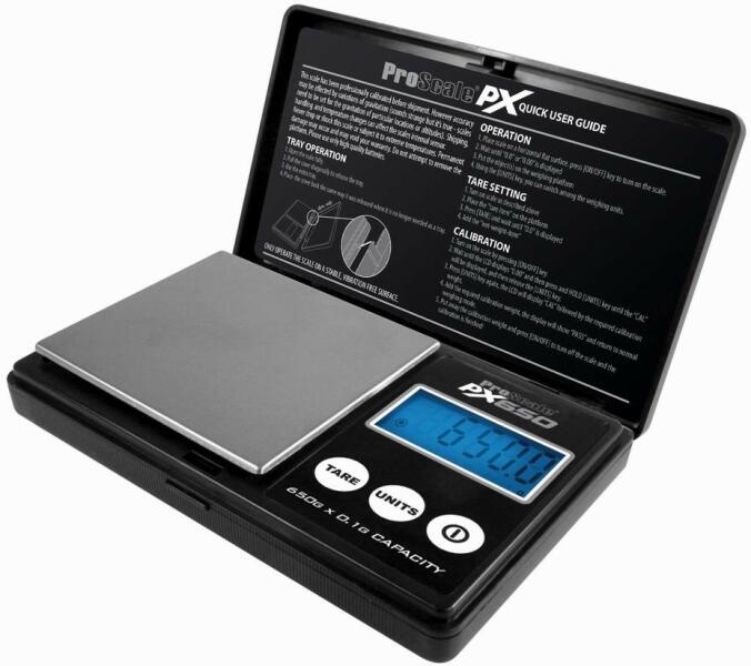 ProScale PX650 digitális mérleg 650g-ig 0,1g pontossággal Mérés g (gramm), oz (uncia), ct (karát) mértékegységekben. t), gn (grain), ozt (troy ounce), dwt (pennyweight) Háttérvilágítású kijelző A mérleg fedele szolgál a mérlegfedélre. tálként szolgál 500 g-os súlyt használnak a kalibráláshoz A mérleglap mérete 7,6 cm x 6,7 cm Tápegység2x 1,5V-os AAA elemmel működik