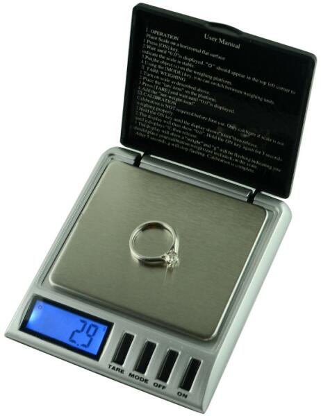 Digitális zsebmérleg 300g-ig, 0,01g pontossággal Mérlegelés g, oz, ozt, ozt, dwt, gn mértékegységekben Mérőpad méretei 7,3cm x 6,5cm, csukható fedéllel Háttérvilágítású kijelző TARE funkció Műbőr védőtok Műbőr tok 2x 1,5V AAA elemmel működik (nem tartozék). Digitális zsebmérleg 300g-ig, 0,01g pontossággal Mérlegelés g, oz, ozt, ozt, dwt, gn mértékegységekben M