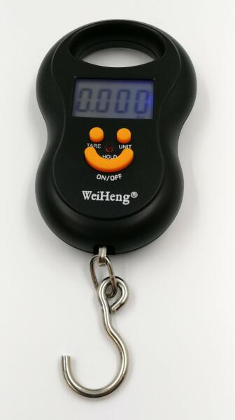 WeiHeng WH-A03L függő mérleg 50kg-ig kettős felbontás: 0-10kg felbontás 5g, 10-50kg felbontás 10g Mérlegel egységekben: Nagy kék háttérvilágítású kijelző Acélhorog, szélesség 2,5cm Kényelmes műanyag fogantyú Alkalmas mérleg horgászoknak és csomagmérlegnek is TARE funkció a mérendő edény súlyának visszaállításához HOLD funkció - a mérlegelt súlyt a kijelzőn