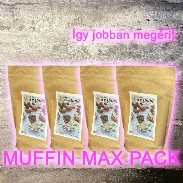 GLUTÉNMENTES MUFFIN MAX PACK LisztMIX MUFFIN MIX (GLUTÉNMENTES, LAKTÓZMENTES, TEJMENTES, SZÓJAMENTES, KUKORICAMENTES) Ez az egyik legnépszerűbb termékeink egyike, ezért úgy gondoltuk, hogy mostantól nagyobb mennyiségben kedvezményesebben adjuk számodra. Azért érdemes a MUFFIN MAX PACK csomagot választanod, mert így 4db 1kg-os kiszerelésű GLUTÉNMENTES MUFFIN MIX -et vásárolhat