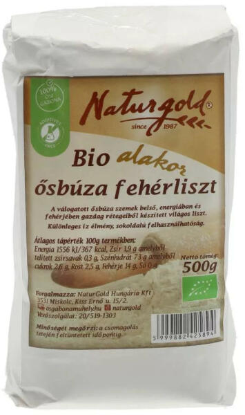 Bio ősbúzaliszt melynek, antioxidáns, nyomelem-, ásványi anyag- és esszenciális aminosav tartalma rendkívül magas. Bátran ajánljuk sütéshez-főzéshez. NATURGOLD BIO ALAKOR ŐSBÚZA FEHÉRLISZT 500G A búza legtisztább formája. Az ősbúza sárga lisztjéből készült ételek könnyen emészthetőek és nagyon finomak. Sárgás színe magas béta-karotin tartalmának köszönhető.