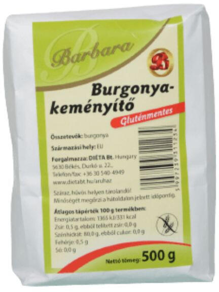 Barbara gluténmentes burgonyakeményítő 500 g A burgonyakeményítő a konyha varázslatos titkaként szolgál. Használható sűrítőként levesekhez és szószokhoz, és tökéletesen működik sütéshez és főzéshez is. Összetevők : burgonya