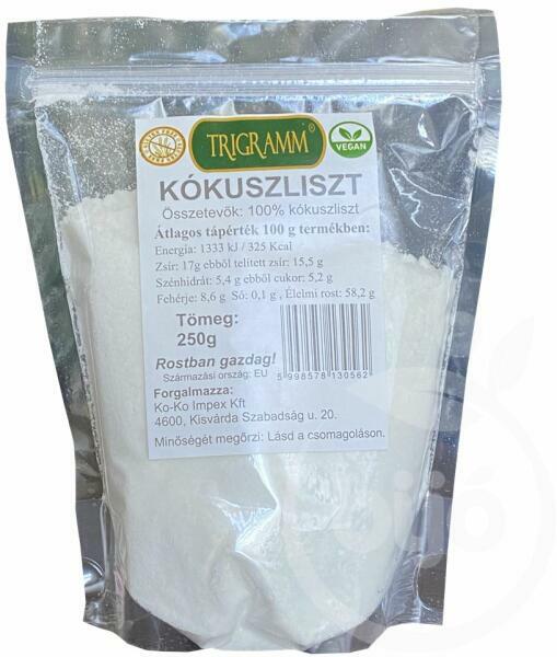 100 % Kókuszliszt. Alacsony zsírtartalmú, finomszemcsés kókuszliszt, amely tökéletesen alkalmas édes, sós sütemények, illetve kenyerek készítéséhez. Gluténmentes termék, hozzáadott adalékanyagot, cukrot, ízfokozót, színezéket nem tartalmaz. Rostban gazdag termék!Jellemzők laktózmentes Igen tejmentes Igen gluténmentes Igen tartósítószer-mentes Igen pálmaolajmentes Ige