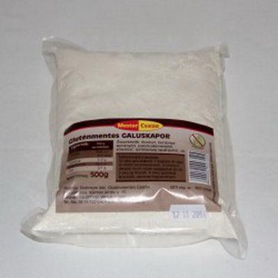 500 g Összetevők: rizsliszt, burgonyakeményítő, kukoricakeményítő, lupinliszt, só, guarmag liszt Tápanyagtartalom 100g termékben:Energia: 1566 kJ/373 kcalFehérje: 4,9 gSzénhidrát: 85,7 gZsír: 0,7 g Recept:Galuska alapreceptHozzávalók (5-6 személyre):50 dkg liszt2 tojásvízSóElkészítés: A tojásokat dolgozd össze a liszttel, sóval és annyi vízzel, hogy közepes sűrűség