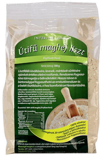 INTERHERB GURMAN Útifű maghéj liszt - Psyllium Husk - 300 g INTERHERB GURMAN Útifű maghéj liszt -Psyllium Husk- 100% növényi Tömegének 20-szorosára képes duzzadni Segíti a bélműködést Diétázók számára is ideális Hosszútávon fogyasztható Lisztfélék kiváltására, levesek, mártások sűrítésére ajánlott értékes élelmi rostforrás. Rendszeres fogyasztása támo
