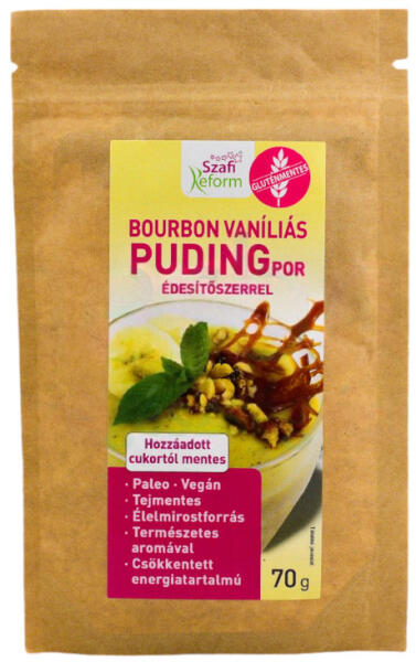 Paleolit és vegán étrendbe egyaránt illeszkedő pudingpor. -65%-al csökkentett kalóriatartalmú gluténmentes pudingpor, amely nem tartalmaz glutént, tejet, tojást, szóját, színezőanyagot és hozzáadott cukrot! Felhasználási javaslat: Hozzávalók: 35 g Szafi Reform csokoládé ízű pudingpor 2 dl növényi tejhelyettesítő (pl. Alpro édesítetlen mandulaital) kb. 10-15 g cukorna