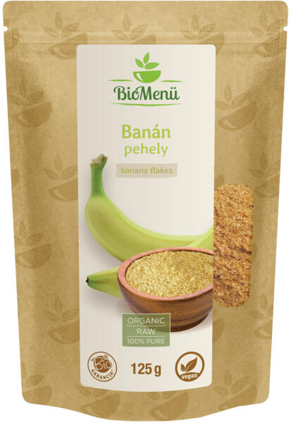 BioMenü bio banán pehely 125 g Természetes banáníz az ételeinkhez! Hosszan eltartható, közkedvelt és természetes íz, amivel számtalan ételünket finomabbá tehetjük.