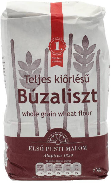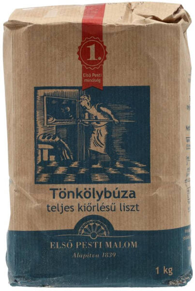 Első Pesti Malom tönkölybúzaliszt; kézműves őrléssel készült teljes kiőrlésű liszt. Kenyérsütéshez, tésztákhoz. Magas rost- és fehérjetartalommal.