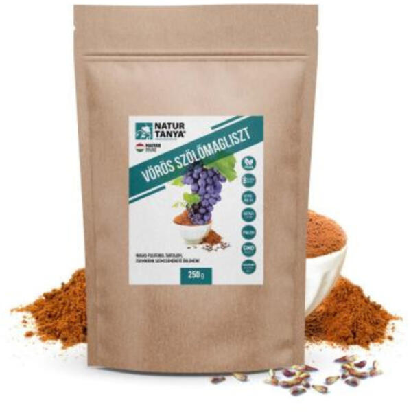 Natur Tanya® Prémium VÖRÖS SZŐLŐMAGLISZT – Adalékanyagmentes, 250 mikron szemcseméret 250g ADALÉKANYAGMENTES, PRÉMIUM VÖRÖS SZŐLŐMAGLISZT A szőlő apró magjai értékes antioxidáns hatású polifenolokat, OPC vegyületeket és ásványi anyagokat rejtenek. A szőlőmagokból előbb szőlőmag olajat sajtolunk, majd ahhoz, hogy a magmasszában található tápanyagok felszínre k