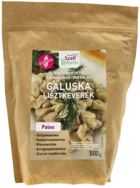 Szafi Reform gluténmentes, csökkentett szénhidráttartalmú galuskaliszt-keverék. Paleo, szójamentes, kukoricamentes, rizsmentes. Rostban gazdag, egészséges galuskaalap.