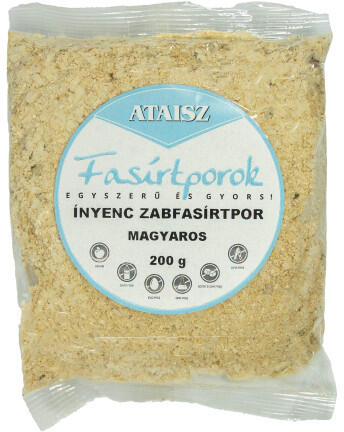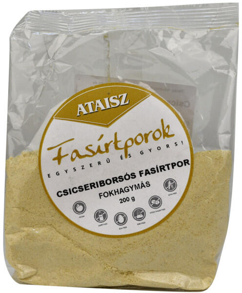 Ataisz csicseriborsós fasírtpor fokhagymás 200 g Tiszta, növényi fehérjeforrás, mely könnyen és gyorsan elkészíthető. A megadott vízmennyiség hozzáadása után, formázás és sütés után fogyasztható. Elkészítés: A tasak tartalmát keverjük el kb. 180 ml vízzel, hogy formázható masszát kapjunk. . 6-8 percig hagyjuk állni. Ezután nem túl forró (!) olajban tetszés sze