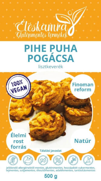 Hagyományos ízvilág, puhaság jellemzi ezt a remek terméket. Elkészítés: Ke verj össze 250 g pogácsa lisztet és 5 g gluténmentes porélesztőt. Add hozzá a 200 ml langyos növényi tejet, 20 ml friss citromlevet, 100 g szobahőmérsékletű puha növényi margarint (lehet kókuszzsír is), 50 g növényi sajtot a tésztába. Mindezt keverd alaposan össze és pihentesd 20 percet hideg