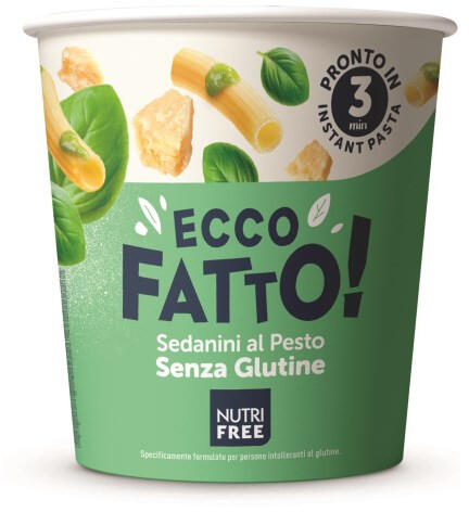 Nf tészta gluténmentes pestos 70 g Speciálisan gluténérzékeny személyek számára készült. Összetevők: gluténmentes tészta 68,6% (kukoricaliszt, rizsliszt, emulgálószer: zsírsavak mono- és digliceridjei), SAVÓ, burgonyakeményítő, RESZELT SAJT 5,6% (TEJ, só, oltó), burgonyapehely (dehidratált burgonya), só, bazsalikom 1,6%, KESUDIÓ, extra szűz olívaolaj 0,6%, természete