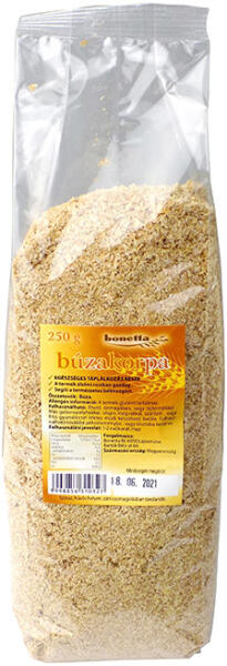Bonetta étkezési búzakorpa 250 g Búzakorpa élelmi rostban gazdag, amely jó hatással van az anyagcsere folyamatokra. Segíti a természetes bélmozgást , valamint csökkenti az éhségérzetet. Ehető önmagában, vagy tejtermékkel. Más gabonapelyhekkel, olajosmagvakkal, szárított, vagy friss gyümölccsel ízletes műzli készíthető belőle. Felhasználható továbbá péksüteménye