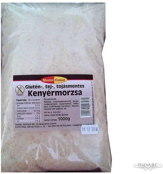 Összetevők: rizsliszt, kukoricakeményítő, burgonyakeményítő, kukoricaliszt, kölesliszt, sűrítőanyag(xanthan), élesztő, növényi zsír(pálma), só. Tápérték 100g termékben: Energia: 1255kJ/299kcal Zsír: 2,9g Telített zsírsavak: 0,6g Szénhidrát: 62,1g Cukrok: 0g Rost: 1,3g Fehérje: 5,4g Só: 0,4g Gyártja: Optimum Kkt. Gluténmentes Üzeme H - 6500 Baja, Kálmán király u.