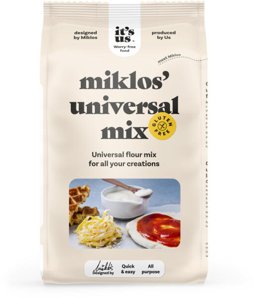 It`s us miklos` universal mix liszt 1000 g Összetevők: kukoricakeményítő, rizsliszt, burgonyakeményítő, dextróz, Kukoricaliszt, stabilizátorok (guargumi, hidroxipropil-metil-cellukóz, xantángumi), útifű, meghéj rost, burgonyapehely, burgonyarost, lisztkezelő szer (aszkorbinsav), almarost. Cukrokból laktóz