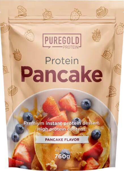 Pure Gold Protein Pancake palacsintaporPure Gold Protein Pancake palacsintapor tejsavófehérjével és édesítőszerekkel, adagonként 14g fehérjetartalommal. Alkalmazás: Keverjen össze 1 adag (1 és 1/2 mérőkanál) port 50 ml vízben és hagyja pihenni 1-2 percig. Ez a mennyiség elegendő 3 kisebb vagy 1 nagyobb palacsintához- A keveréket kevés olajon vagy vajban serpenyőben, közepes
