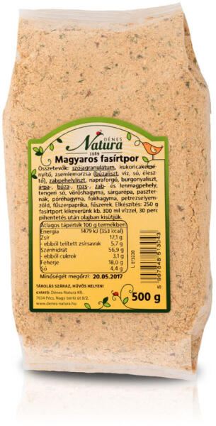 Natura fasírtpor magyaros 500 g NATURA FASIRTPOR MAGYAROS Natura magyaros fasírtpor : keverd el 300 ml vízzel, majd 30 perc pihentetés után, kis pogácsákat formálva forró olajban süsd ki! Készíts hozzá salátát, vagy egy gyors gabonaköretet (bulgur, kuszkusz, köles stb. ), kiváló feltét főzelékekhez is. Ha fasírtot készítesz, bátran tegyél ebből is a húshoz fűszer (és