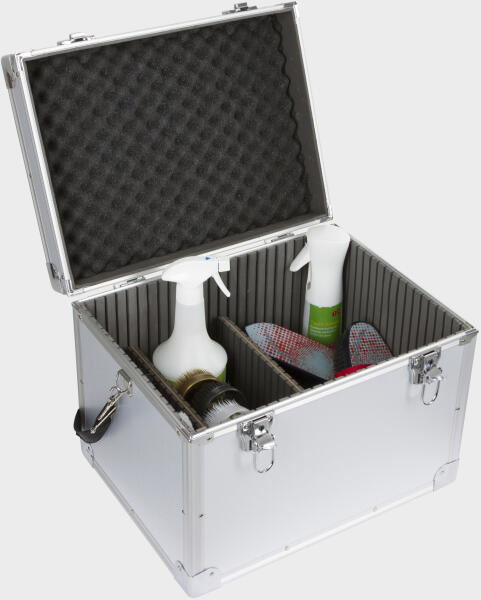 könnyű alumíniumszerkezet a könnyű szállításhoz erősített sarkokkal két válaszfallal, változtathatóan állítható kulccsal zárható teljes habszivacs párnázat belül hordszíjjal praktikus kis rekeszekkel 40 x 30 x 30 cm