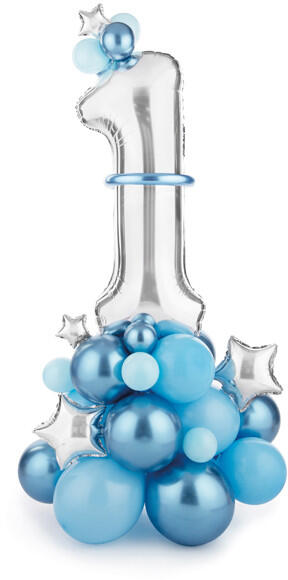 ''1'' számú lufi csokor kék színben, a készlet tartalma: lufi (33 db), habszalag (10 db), modellező lufi (5 db), papírszalma (1 db), fólia lufi (5 db) és 2,5 db. m léggömbfüzér szalag. Mérete kb. 90 x 140 cm. Kézikönyv mellékelve.