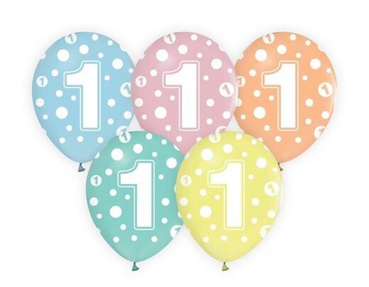 Színes, fehér pöttyökkel és 1-es számmal dekorált luficsomag. A szett 5 db lufit tartalmaz. A lufik felfújt mérete: 30 cm.