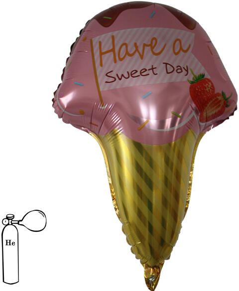 Fólia lufi, fagylalt. Levegővel vagy héliummal is tölthető, önzáró szelepes. Fagylaltozók dekorálására, vidám partikra kiválóan alkalmas. Hélium töltéssel hetekig lebeg. Magassága: 55 cm.