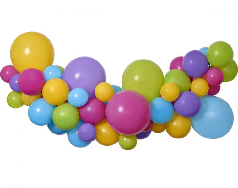 Colorful, Színes léggömb, lufi girland szett 65 db-os Anyaga: latex/gumi Tartalma: - 30 db léggömb 10 inch (26 cm) - 30 db léggömb 5 inch (13 cm) - 5 db léggömb 13 inch (33 cm) - szalag - ragasztópöttyök A kész füzér méretei: 200x50x70 cm