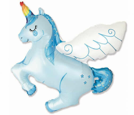 Szivárvány szarvú kék unikornis, mérete 24" (90cm*80cm). Önzáró szelepes. Tölthető levegővel vagy héliummal. Felfújatlanul szállítjuk.