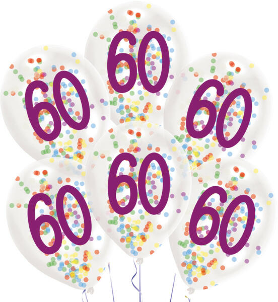Happy Birthday 60 konfettivel töltött léggömb, lufi 6 db-os Anyaga: latex/gumi Mérete: 11 inch (27,5 cm) A lufi tartó pálca + csésze külön megvásárolható áruházunkban ( KFJ_DPA9911929vagyKFJ_DPA9917359 ).