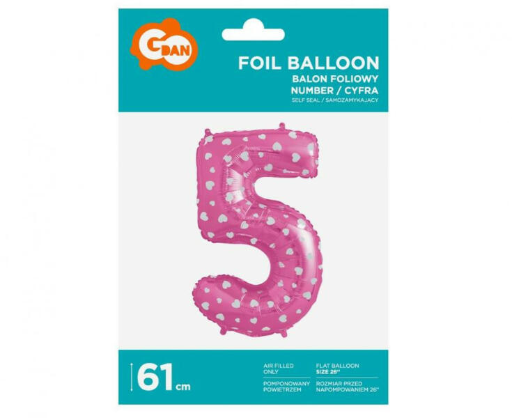 Pink with Hearts, Rózsaszín 5-ös szám fólia lufi 61 cmFólia léggömb, mely héliummal vagy levegővel tölthető. A lufi önzárószeleppel van ellátva, amely megakadályozza a gáz elszökését. Méret: 61 cm Anyaga: fólia A lufi tartó pálca + csésze külön megvásárolható áruházunkban. Pink with Hearts, Rózsaszín 5-ös szám fólia lufi 61 cmFólia léggömb, mely héliummal