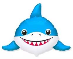 Kék színű, cápa formájú fólia lufi mosolygós arccal. Ajándék születésnapra, névnapra. Héliummal és levegővel felfújható.