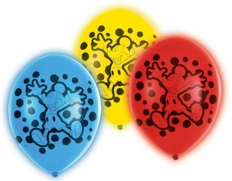 Disney Mickey Világító LED léggömb, lufi 5 db-os 11 inch (27 cm)Csak húzzuk ki a biztosító papírt a lufiból, és már működik is, ezután már csak fel kell fújnunk. Aktiválás után a LED kb. 24 órán keresztül világít. Anyaga: latex/gumiMérete: 11 inch (27 cm)A lufi tartó pálca + csésze külön megvásárolható áruházunkban